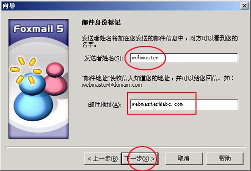 4、輸入自己姓名(如webmaster)和自己的郵箱地址(如webmaster@abc.com),接著按“下一步”,界面如下: