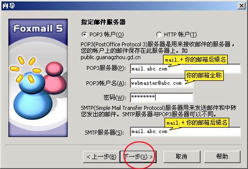 (4) 如果是接郵箱是。確認(rèn)你正確輸入密碼后。軟件還是提示你輸入密碼不正確請(qǐng)檢查第13步(在POP3帳戶名那欄輸入你自己完整的郵箱帳號(hào)和密碼)如POP3帳戶名那欄輸入:(webmaster@abc.com你自己完整的郵箱帳)密碼(你自己郵箱密碼)